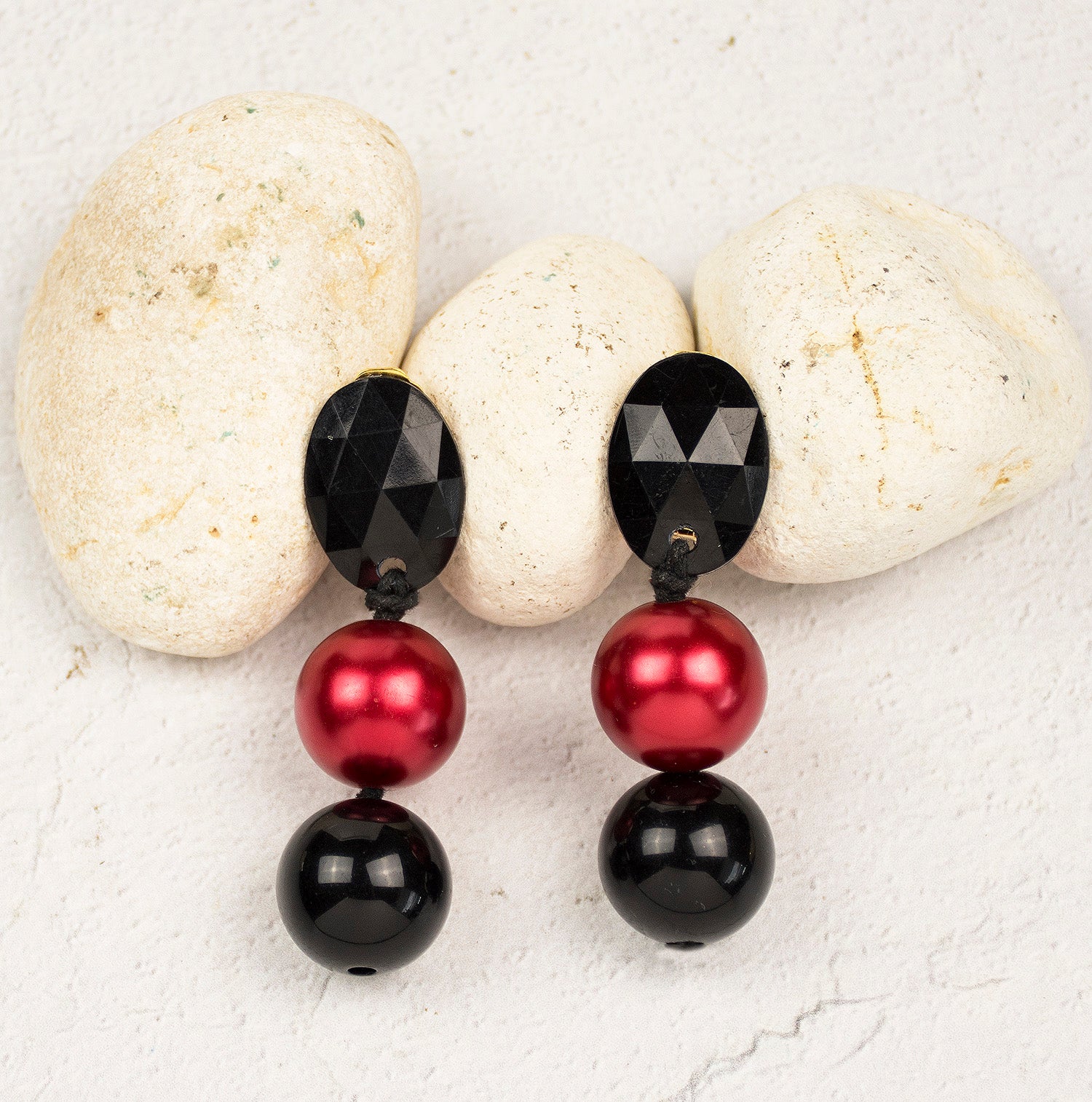BOLD RED TRIPLE-DROP ACRYLIC & FAUX PEARL EARRINGS.BLACK/RED