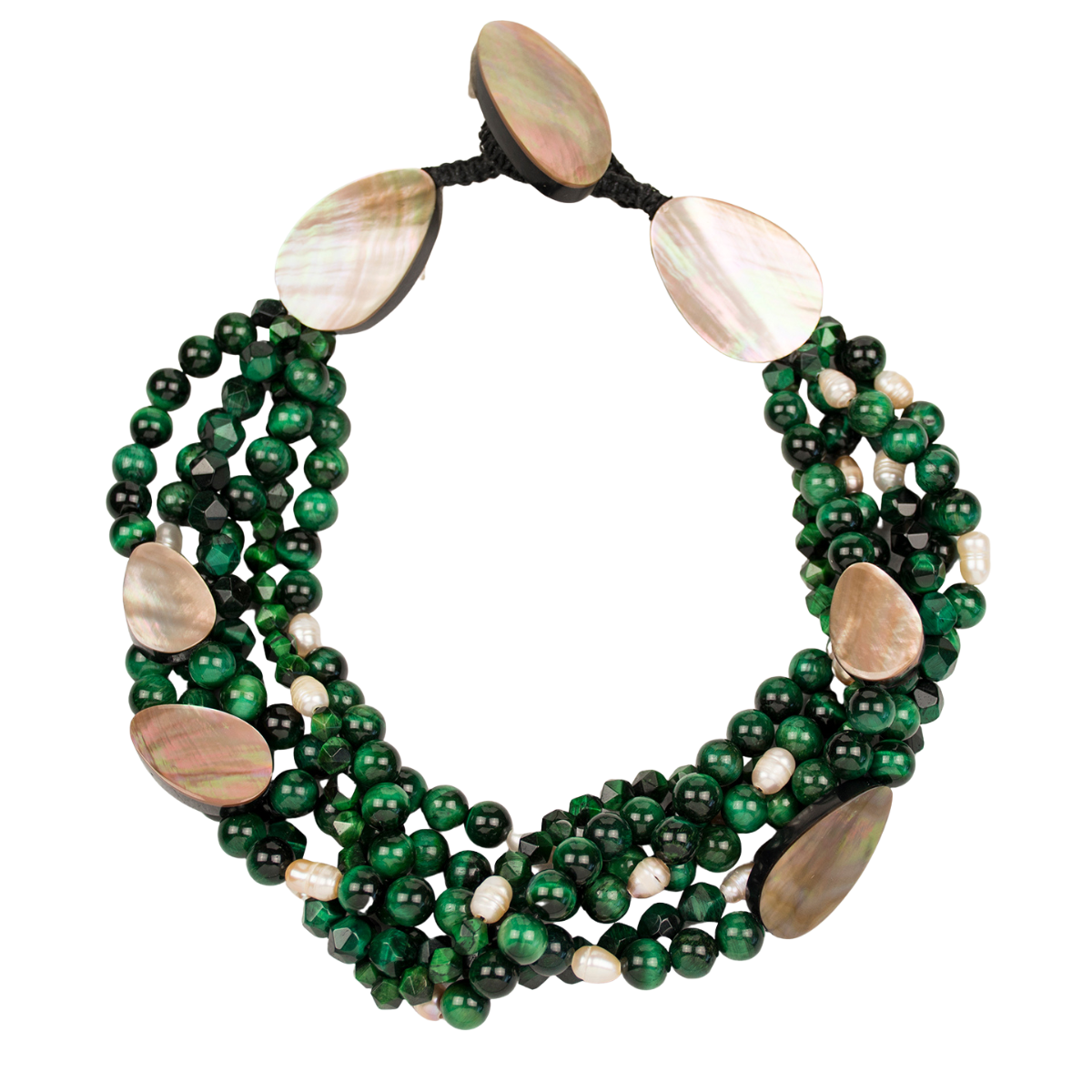 EMERALD TIGER EYE & BLUSH PEARL TORSADÉ NECKLACE.GREEN/BLUSH