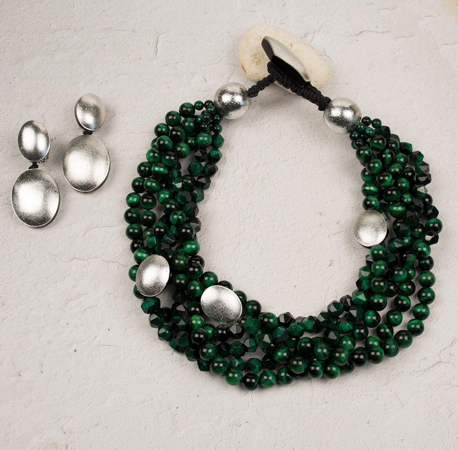 EMERALD TIGER EYE TORSADÉ NECKLACE. GREEN/SILVER