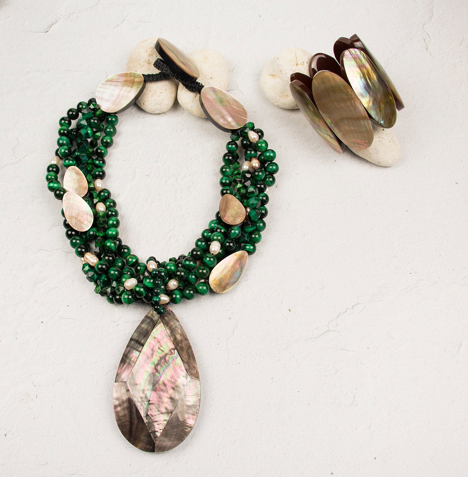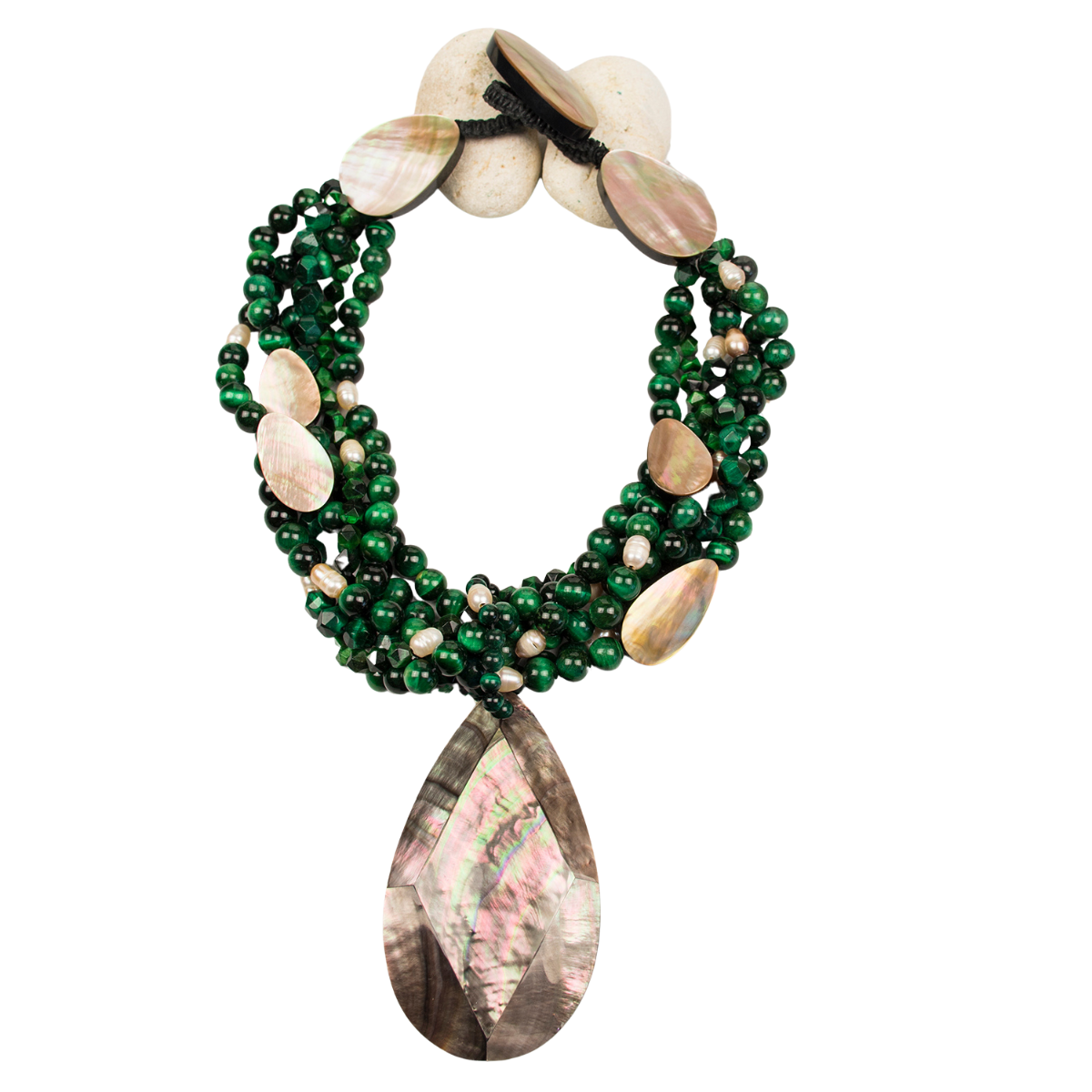 EMERALD TIGER EYE TORSADÉ NECKLACE WITH PEARL PENDANT.GREEN/BLUSH