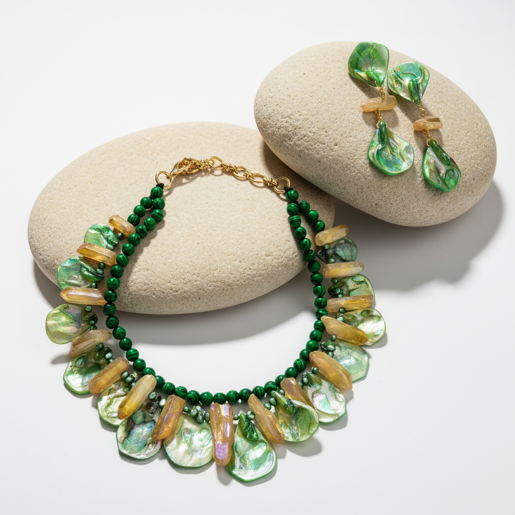 At the center, a stunning citrine-shade crystal glows warmly, adding brilliance and depth — like sunlight captured between delicate leaves. The combination of iridescent green and radiant golden sparkle creates a look that is both vibrant and elegant.