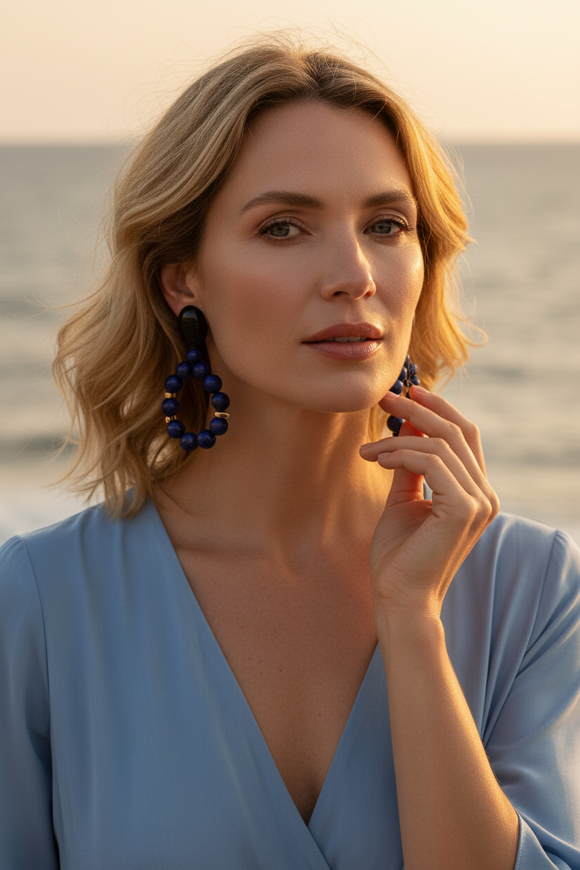 Get glowing with earrings designed to command attention. These striking lapis statement earrings feature rich, celestial-blue stones accented with warm gold details, creating a luminous contrast that feels both bold and refined. Finished with a sleek black resin top, the elongated drop silhouette adds drama while remaining effortlessly wearable.