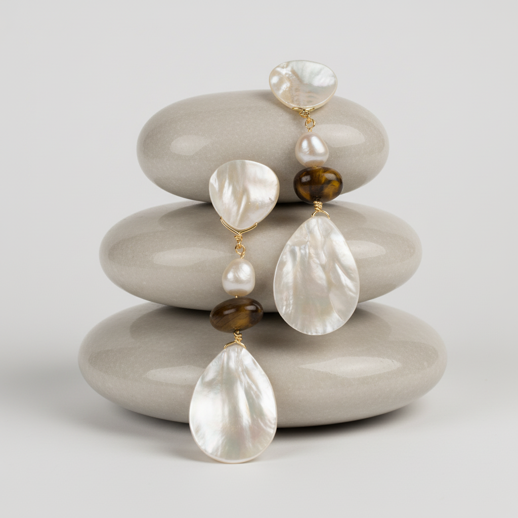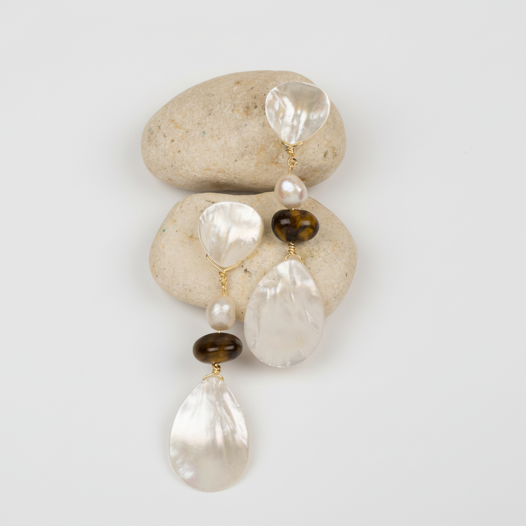 A rich tiger’s eye accent introduces warm golden-brown depth, catching the light with its signature silky luster and subtle movement. The blend of creamy pearl tones and earthy tiger’s eye creates a look that is both grounded and graceful.