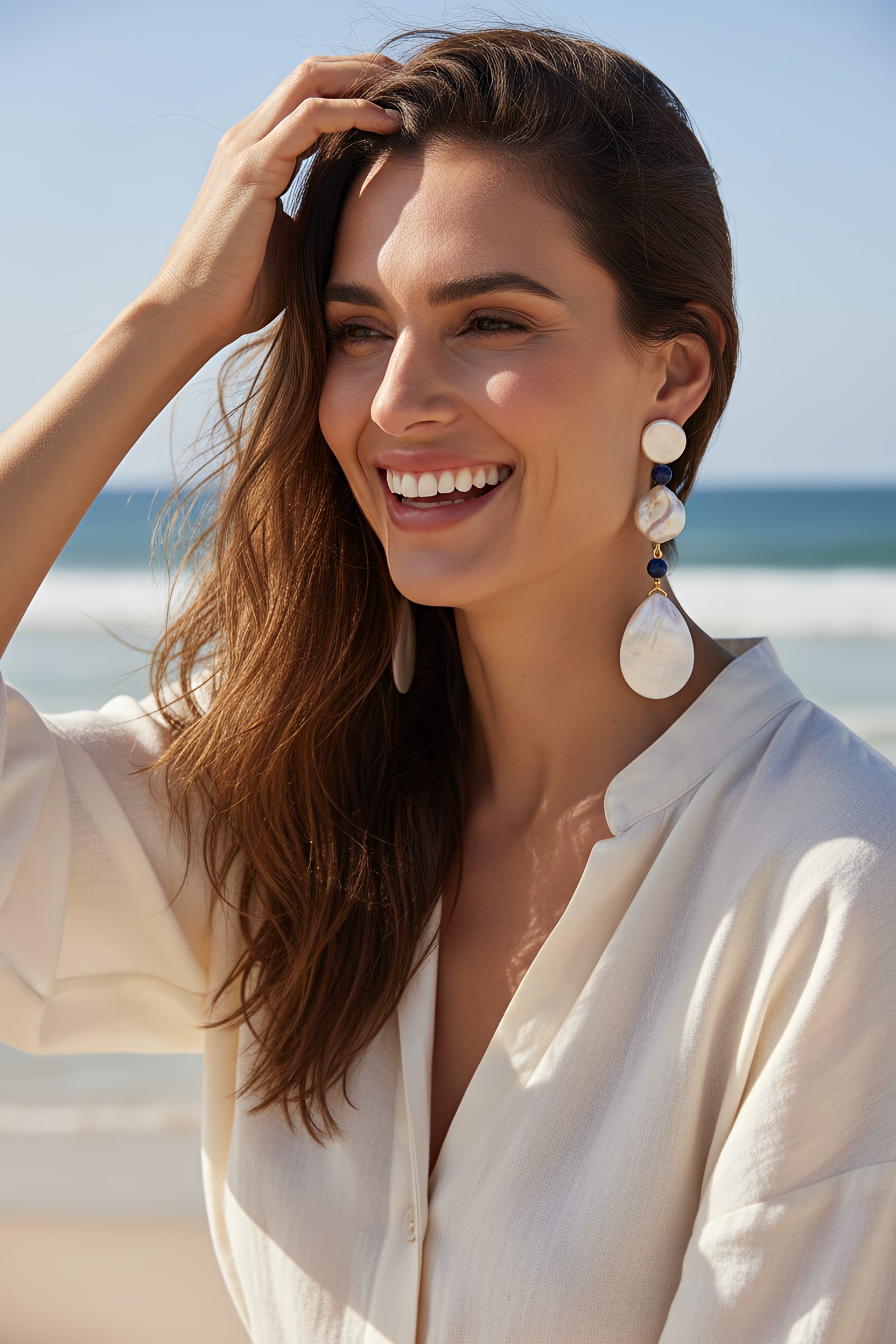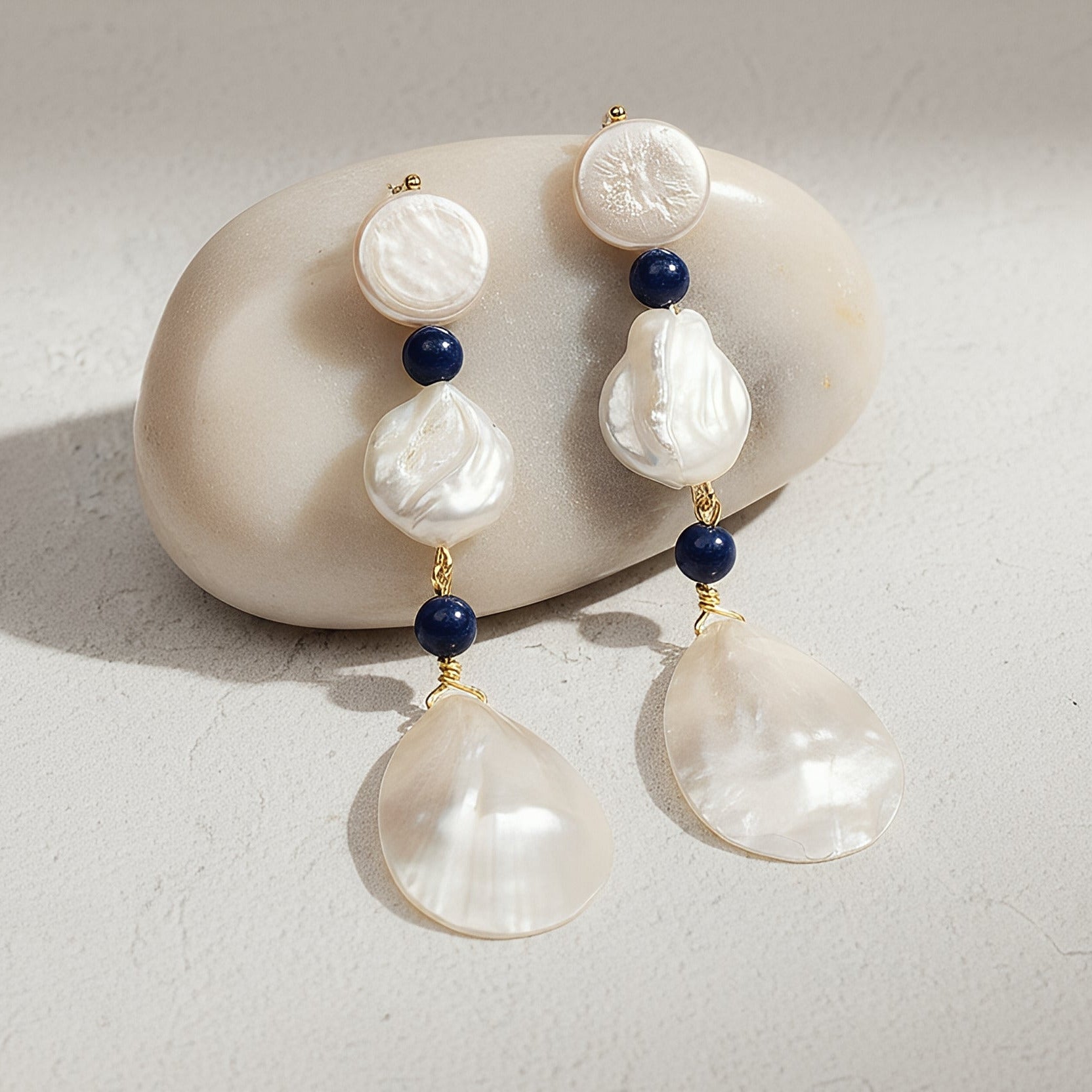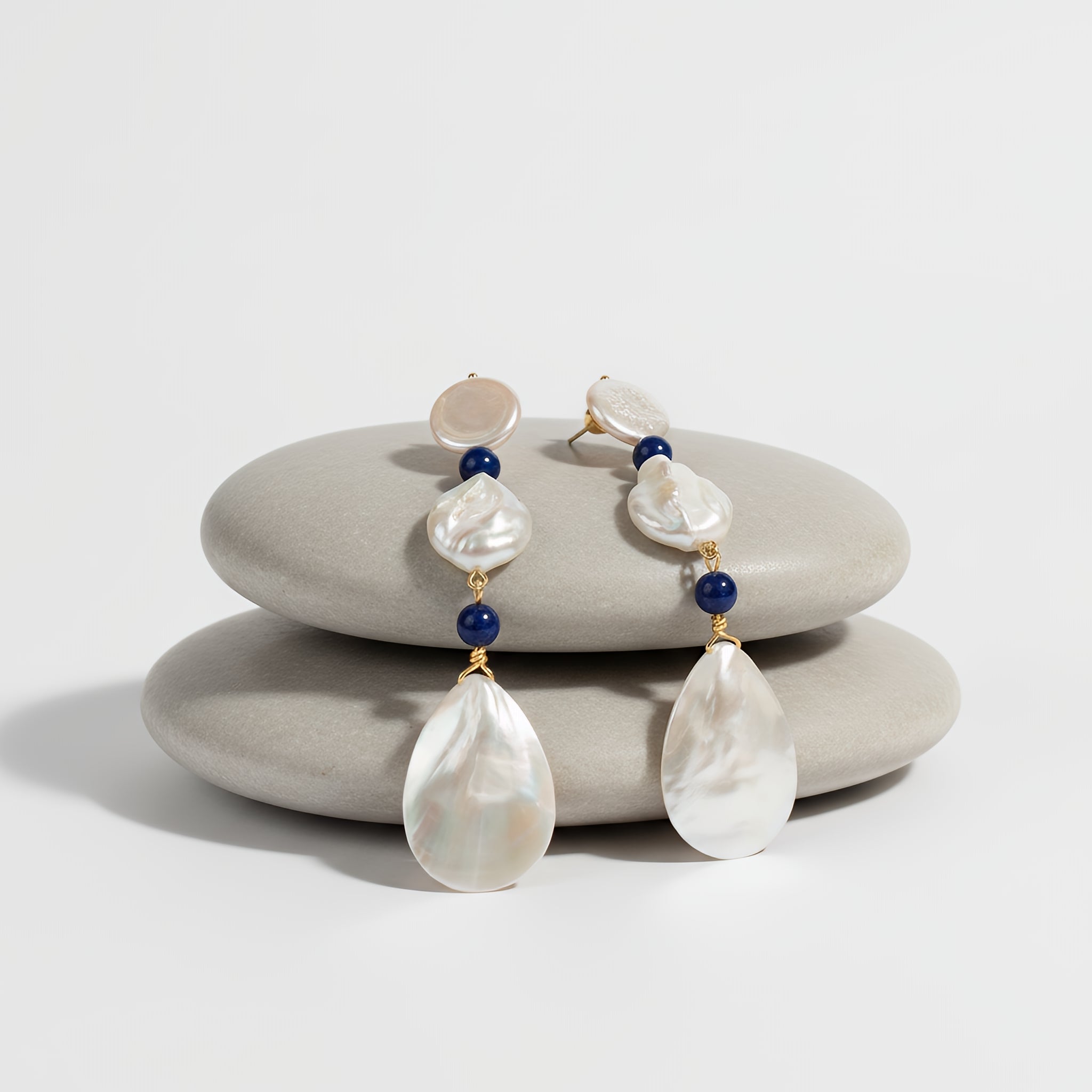 Breathtakingly beautiful and undeniably striking, these 4-inch statement linear earrings are a graceful fusion of light and depth. Luminous mother of pearl glows with soft iridescence, creating a radiant contrast against rich lapis accents that add a touch of bold, royal blue elegance.
