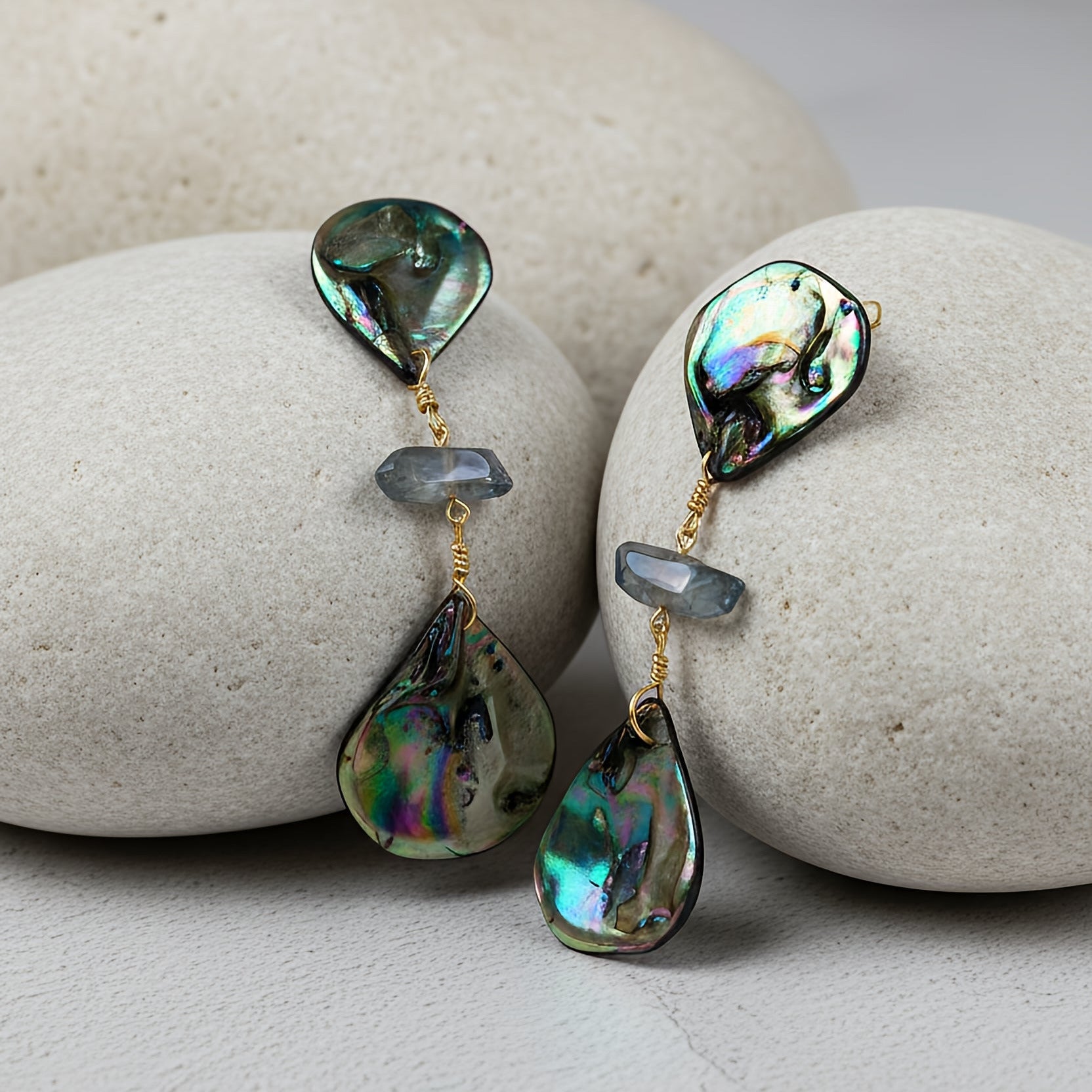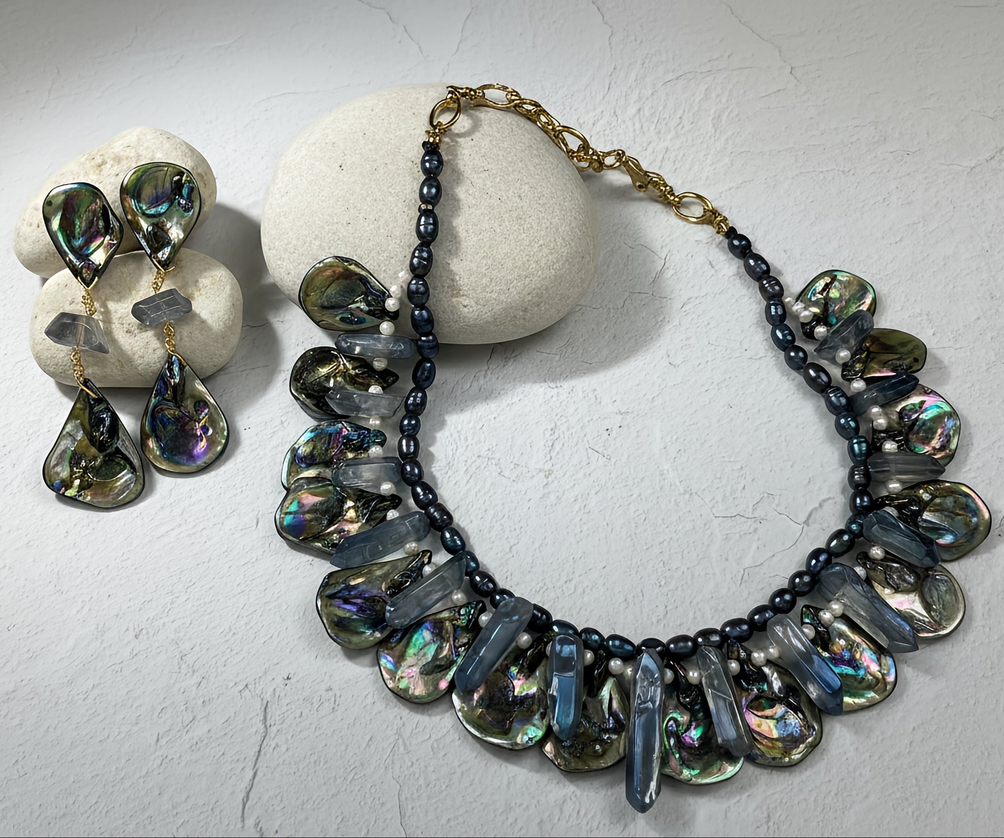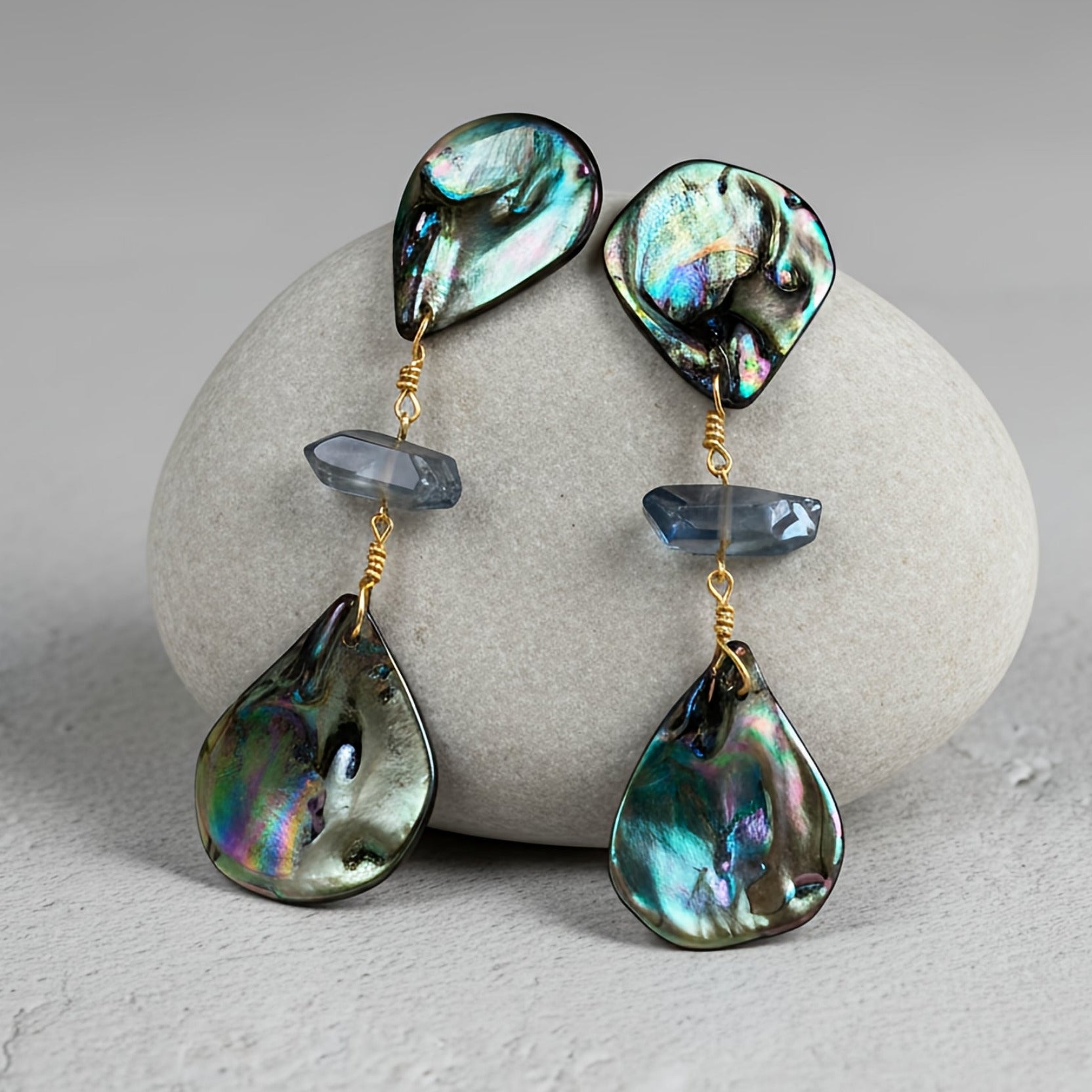 These elegant statement earrings reflect the luminous beauty of ocean tones, featuring iridescent blue shell petals that shimmer with deep blue, teal, and subtle violet hues. Blue-toned quartz accents add a graceful vertical flow, enhancing the natural brilliance and movement of the design.