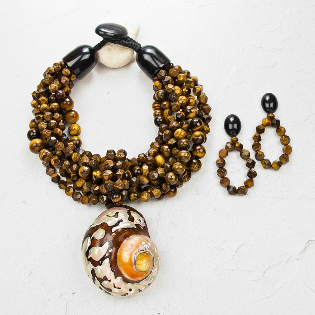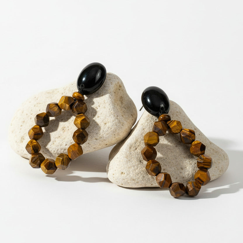 Earthy elegance meets modern design in these captivating tiger eye statement earrings. Faceted tiger eye beads reveal natural bands of golden brown and deep amber, catching the light with rich depth and warmth. Anchored by a smooth black resin top, the sculptural drop shape delivers a powerful yet balanced silhouette.