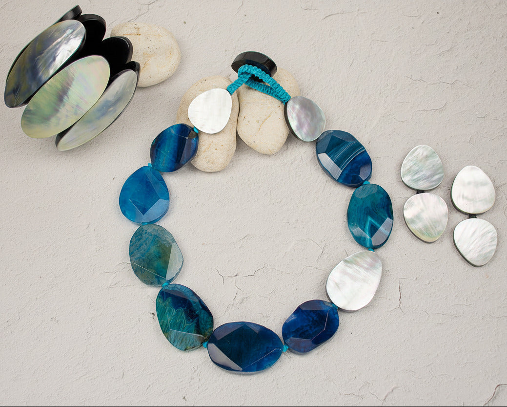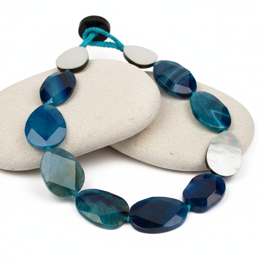 Designed to captivate, this blue agate statement necklace is a refined expression of color, light, and natural artistry. Faceted blue agate stones shimmer with depth and movement, reflecting subtle variations that feel both powerful and serene. Silver mother-of-pearl accents introduce a luminous contrast, adding softness and quiet sophistication to the bold composition.