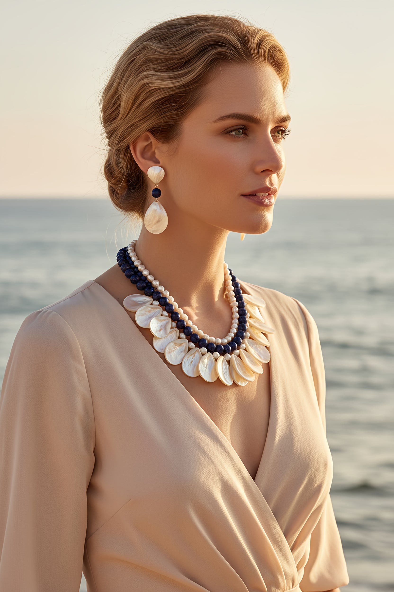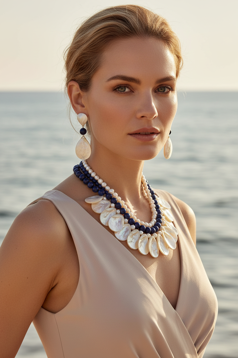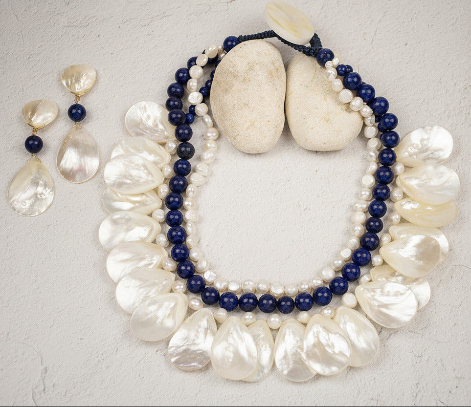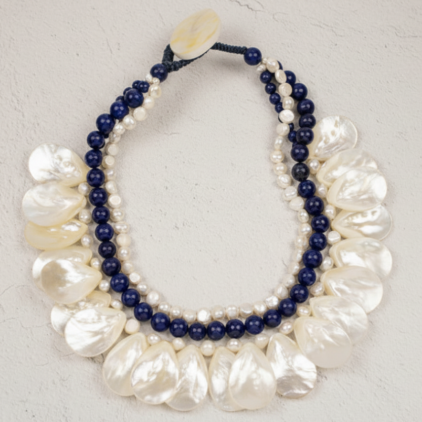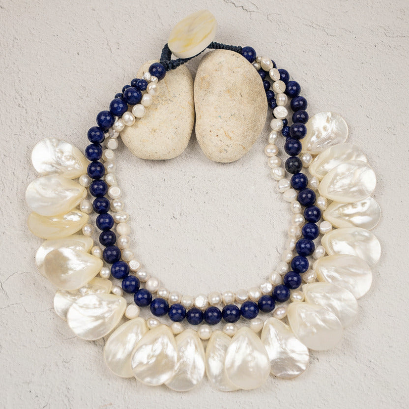 Born of deep blue horizons and sunlit coastal evenings, this glamourous nautical statement necklace features cascading Mother-of-Pearl petals accented with rich lapis tones, reflecting the depth and beauty of the open sea. Freshwater pearls add a soft, luminous glow, creating a striking balance of color, texture, and timeless elegance.