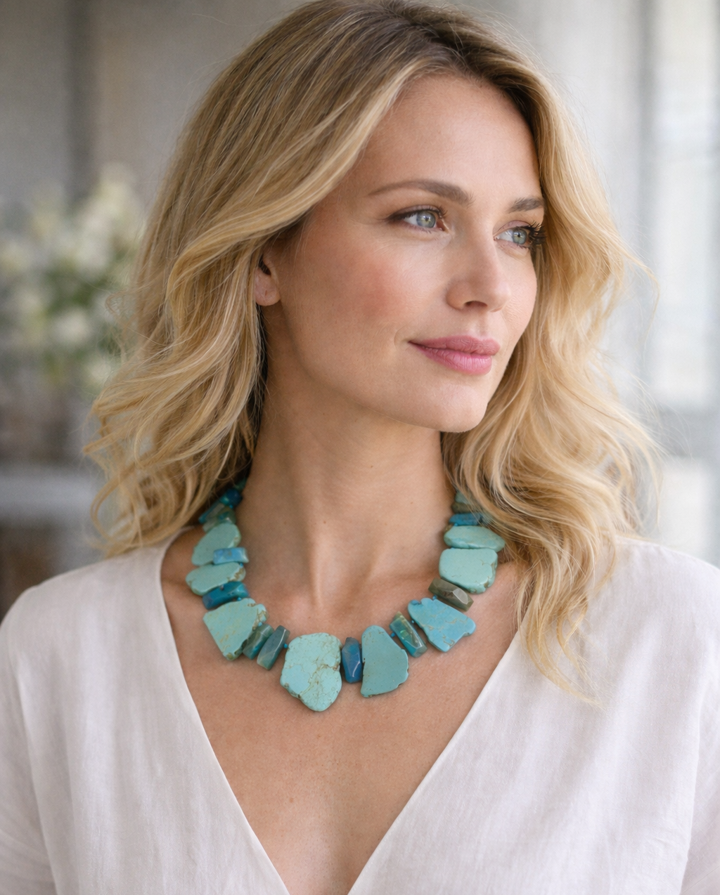 GOLDEN GLOW BLUE HOWLITE STATEMENT NECKLACE. BLUE/GOLD