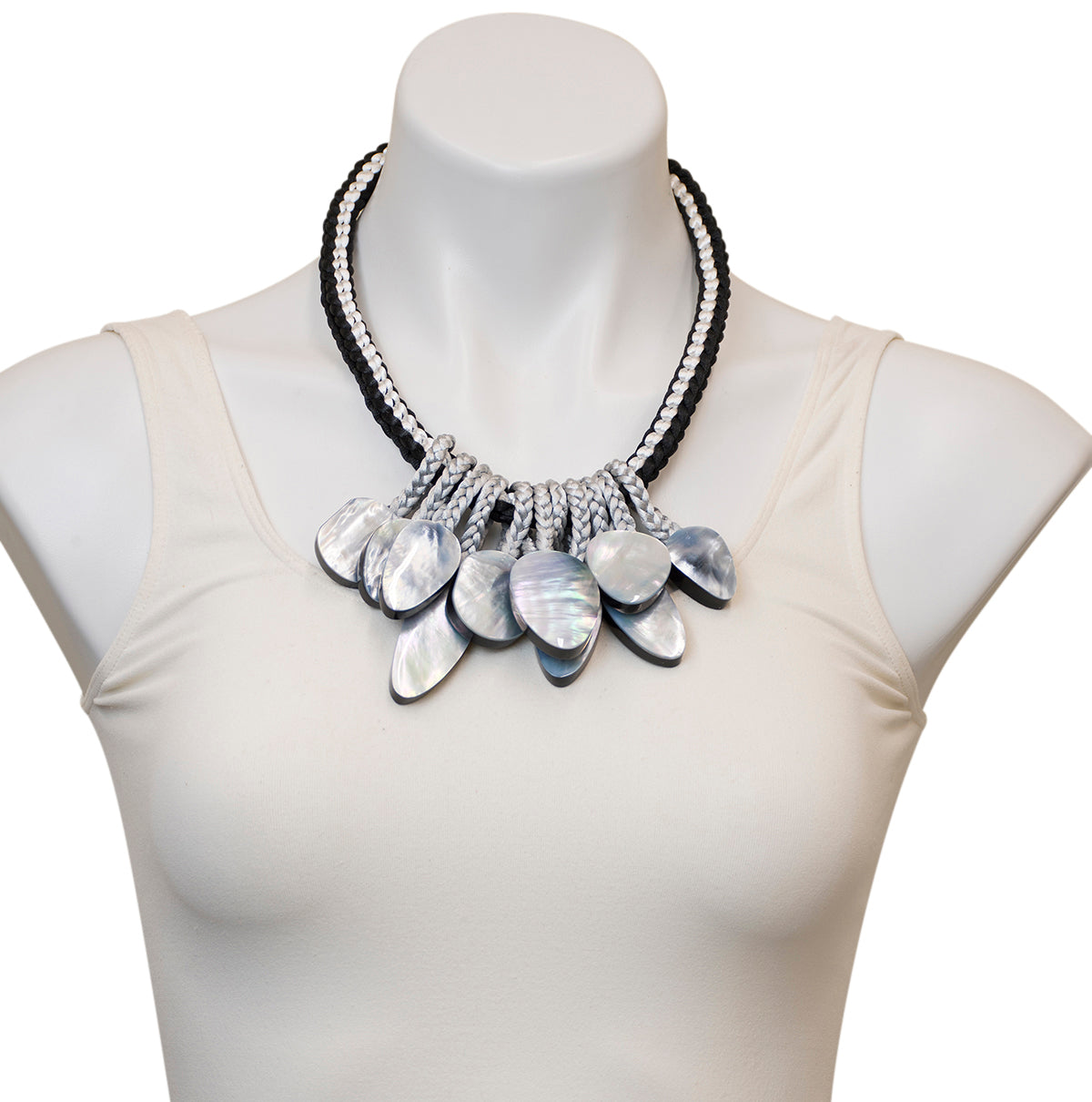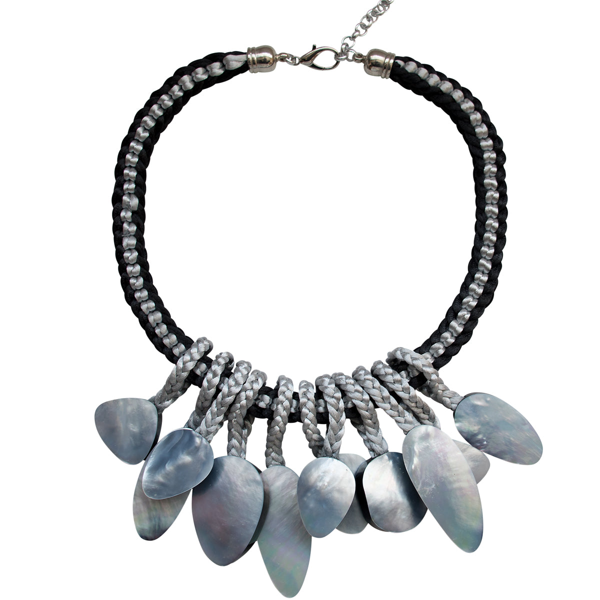 MACRAME SHELL PETAL COLLAR CHARM COLLAR NECKLACE. SILVER/BLACK