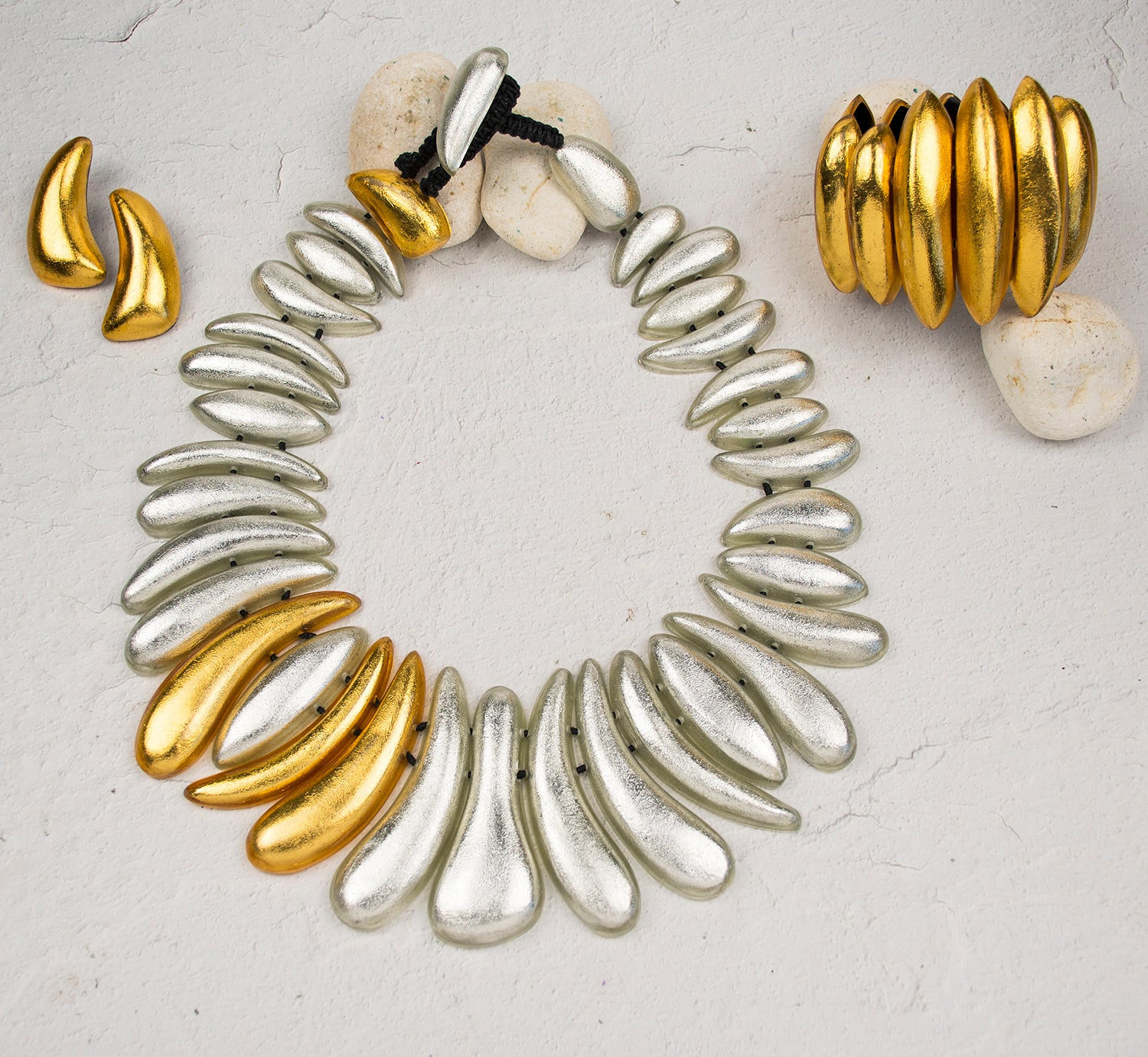 Big on personality, light in weight—this silver foil laminated necklace features a striking gold accent on one side for a bold, asymmetrical look. The mix of silver foil and black resin creates dramatic contrast, while the gold detail adds a warm, modern edge.