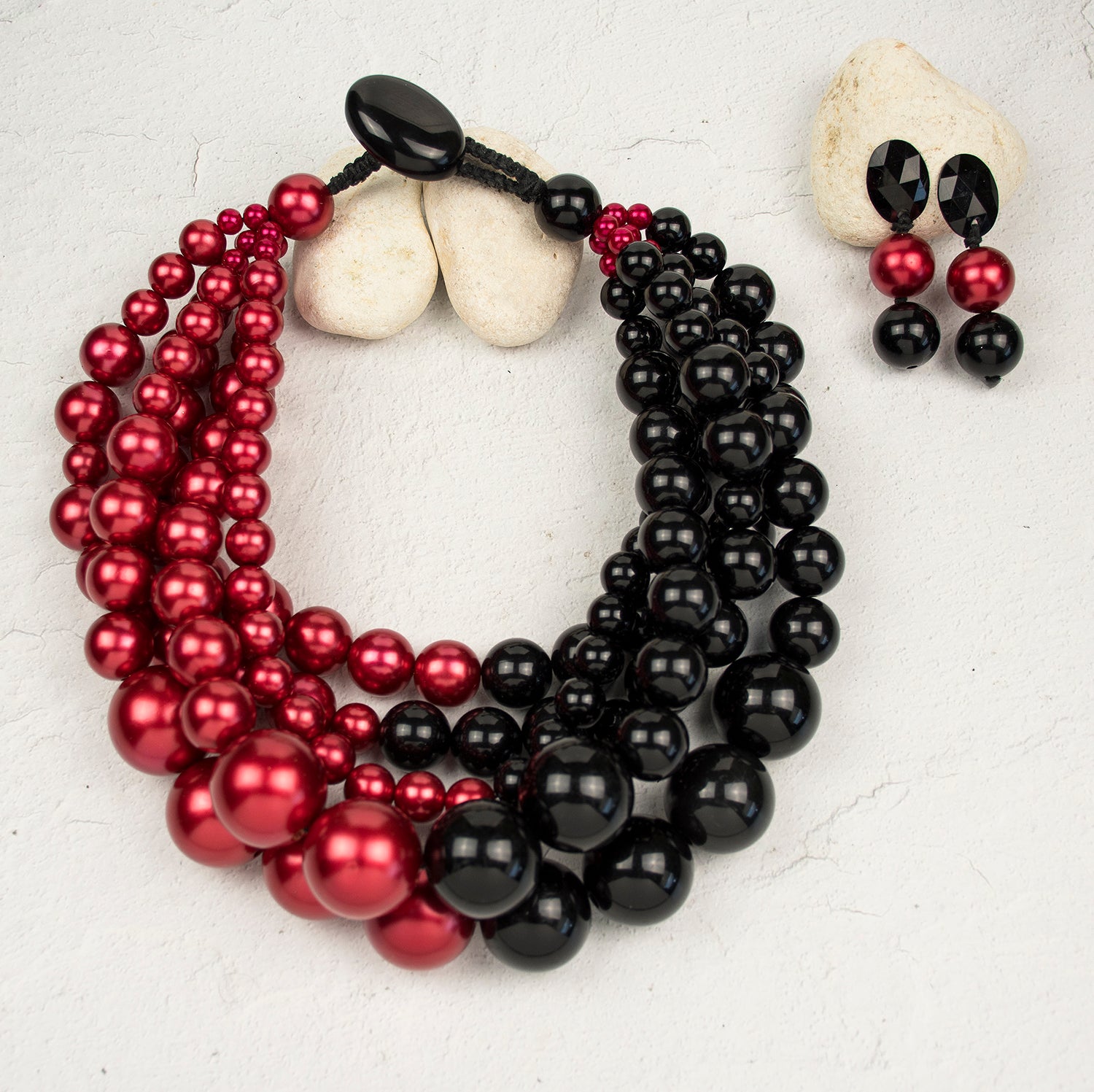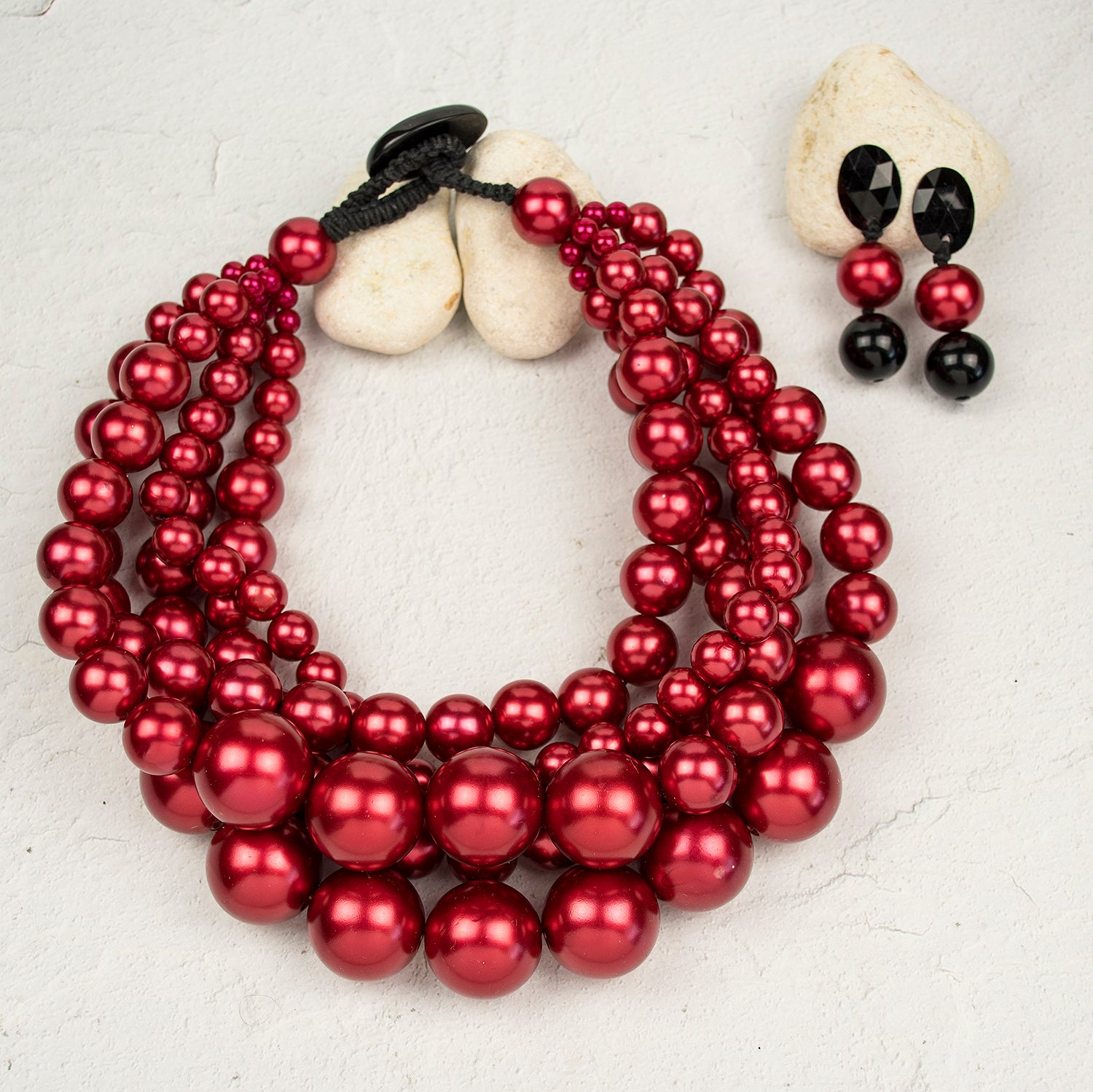 BOLD RED TRIPLE-DROP ACRYLIC & FAUX PEARL EARRINGS.BLACK/RED