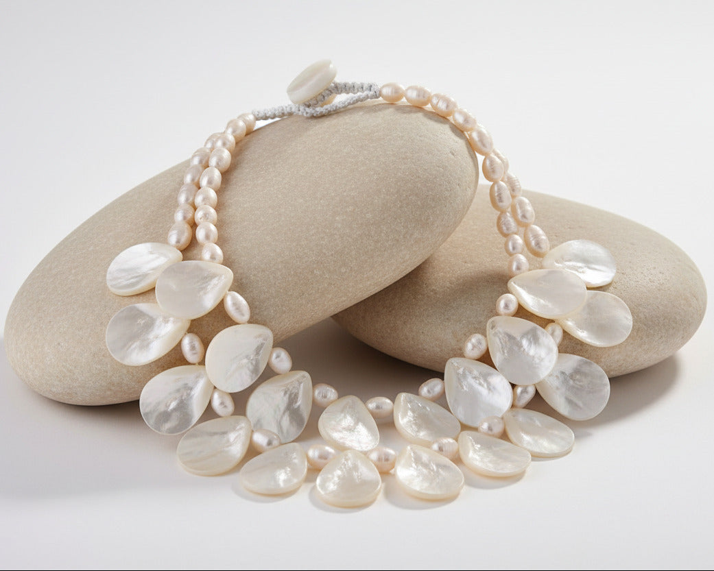 Make an unforgettable statement with this shockingly luminous freshwater pearl and mother-of-pearl petal necklace, designed to anchor your most loved outfits with effortless elegance. Two radiant rows of oversized iridescent MOP petals (25 × 35 mm) cascade beautifully along the neckline, each one catching the light with a soft, ocean-born shimmer.