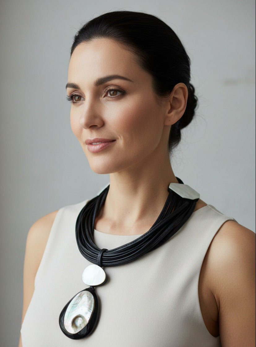 Statement style that says you're unique. Find it in this beautifully bold and naturally distinctive design. Gorgeous Mabe Pearl is set in the black resin drop pendant with MOP top and suspended from the rows of the faux leather cords. Finished with a macrame button closure. Necklace measures 19 1/2” in length, 4 ½” X 2 1/2” pendant. Silver MOP/ resin, genuine Mabe Blister Pearl faux leather cords. Every Blister Pearl is one of a kind.