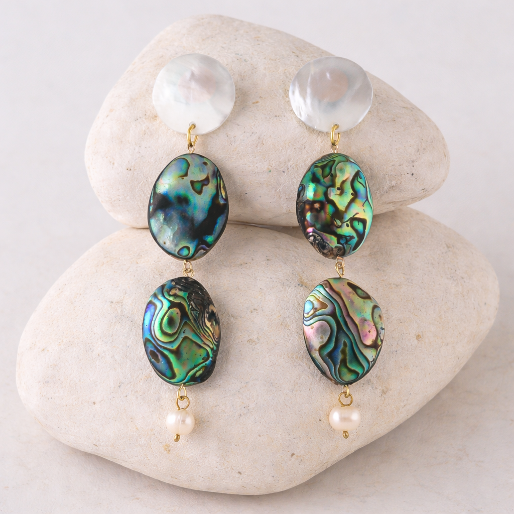 MOTHER-OF PEARL AND ABALONE DANGLE EARRINGS. PEARL WHITE/ABALONE