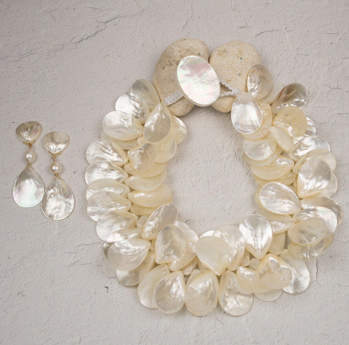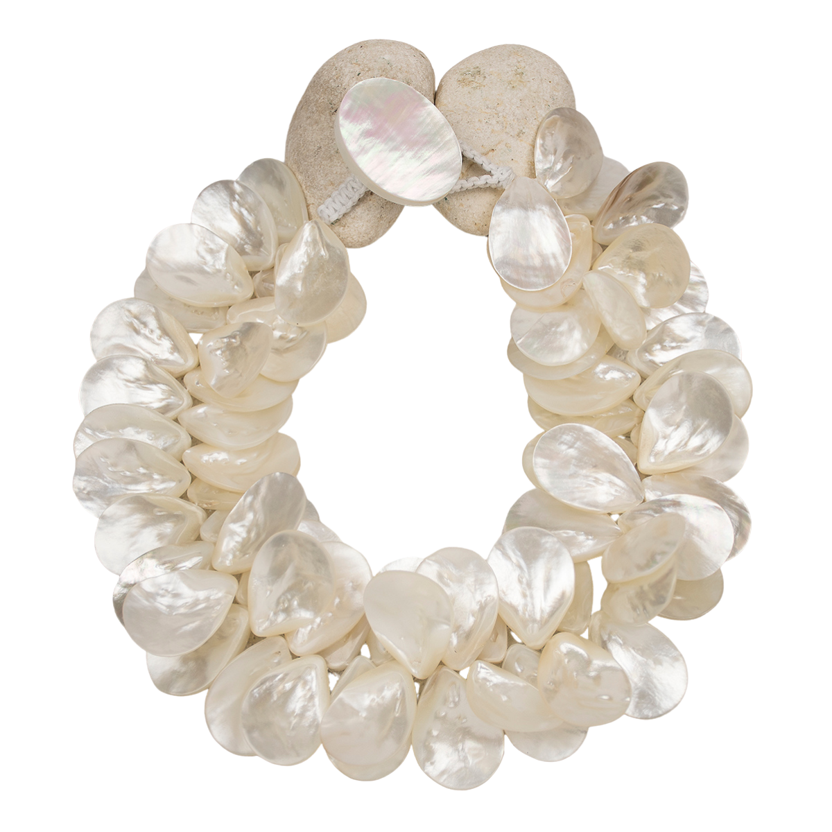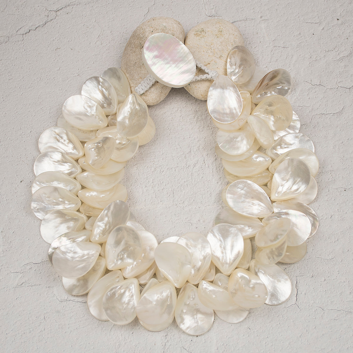 Hand-strung with oversized, luminous mother-of-pearl petals, the necklace forms a stunning clustered silhouette that creates graceful movement and a soft, iridescent glow. Each petal is thoughtfully arranged to showcase texture and depth, giving the piece an artistic yet effortlessly glamorous feel. Finished with a macramé button closure, it offers both comfort and handcrafted charm.
