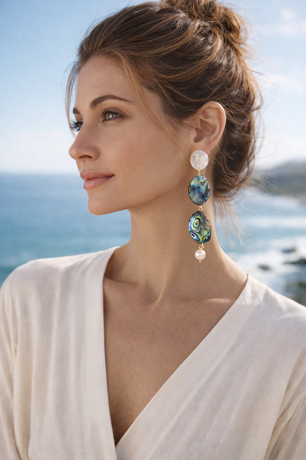 MOTHER-OF PEARL AND OVERSIZED ABALONE DROP EARRINGS. WHITE/ABALONE