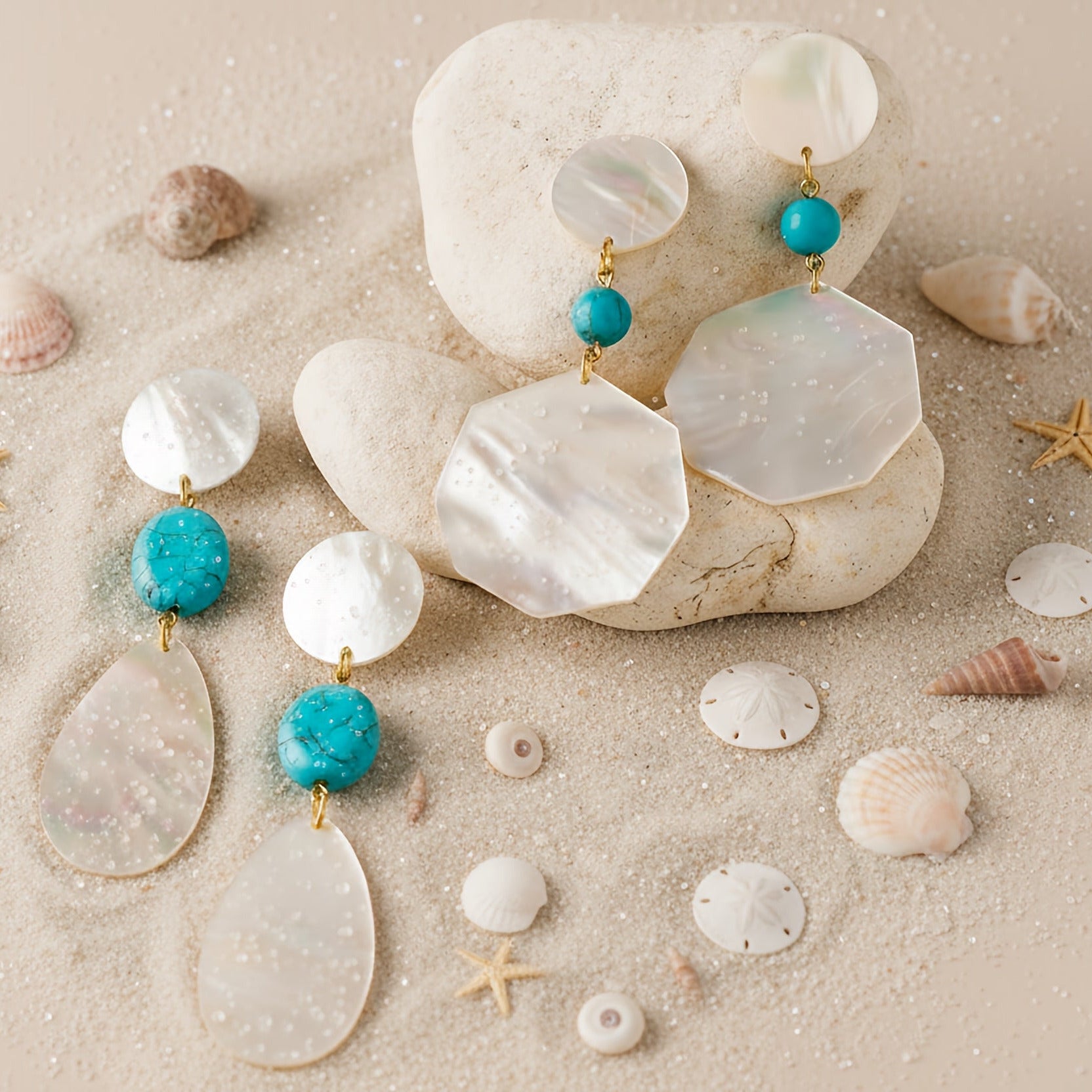 DOUBLE DROP MOTHER OF PEARL AND BEAD ACCENT EARRINGS. WHITE/BLUE