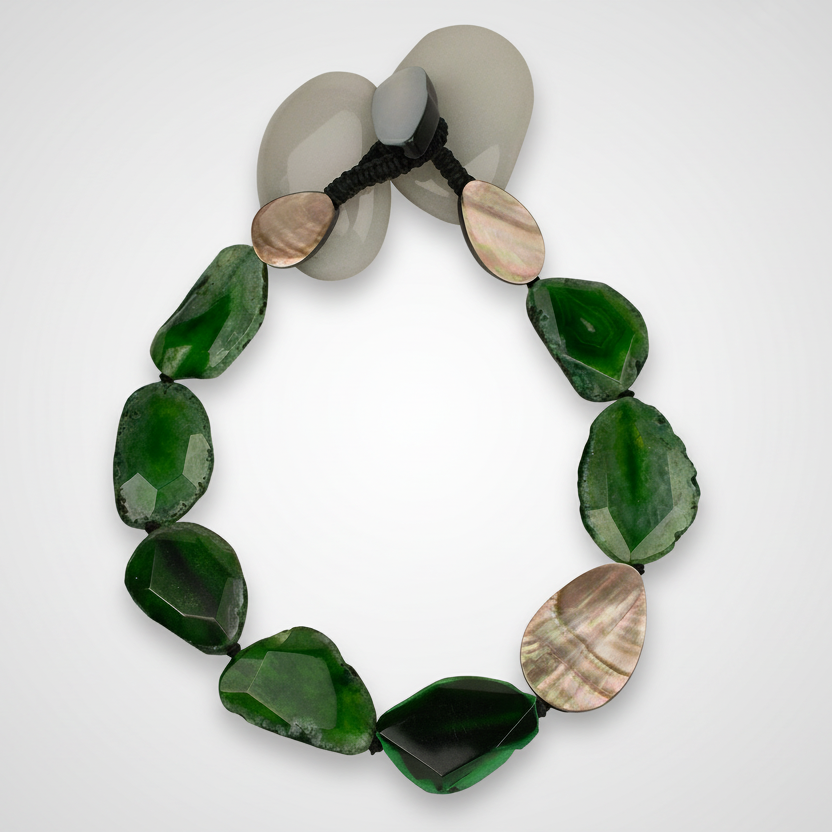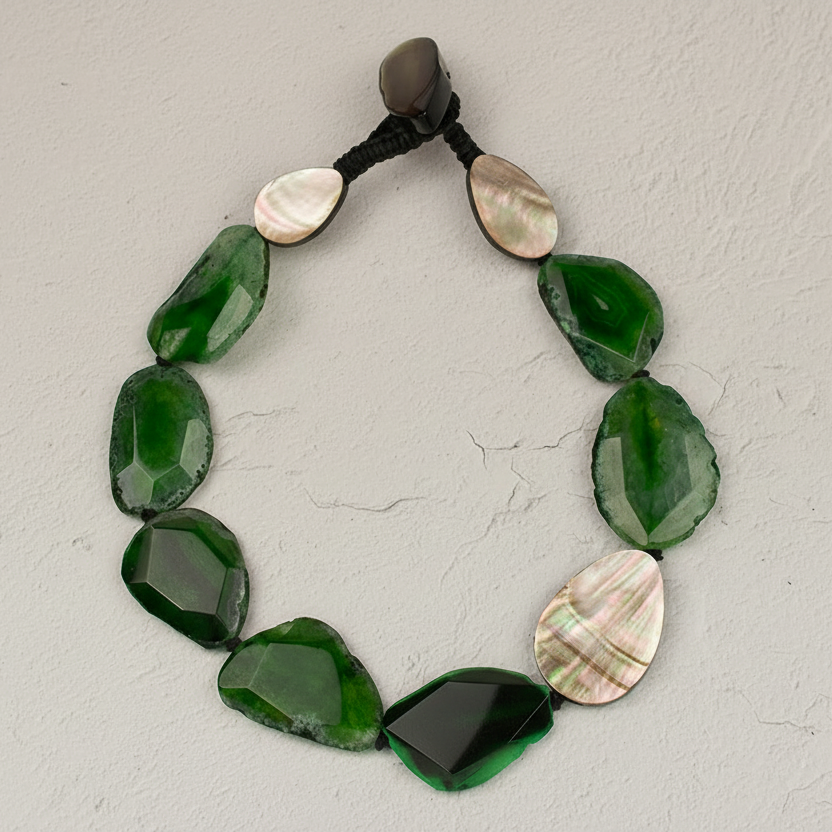 This stunning green agate necklace is designed to captivate with its rich color, radiant texture, and artistic elegance. Faceted green agate stones catch the light from every angle, creating beautiful depth and movement, while a striking blush mother-of-pearl accent adds a soft, luminous contrast that brings the design to life.