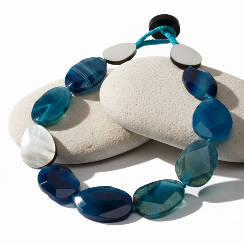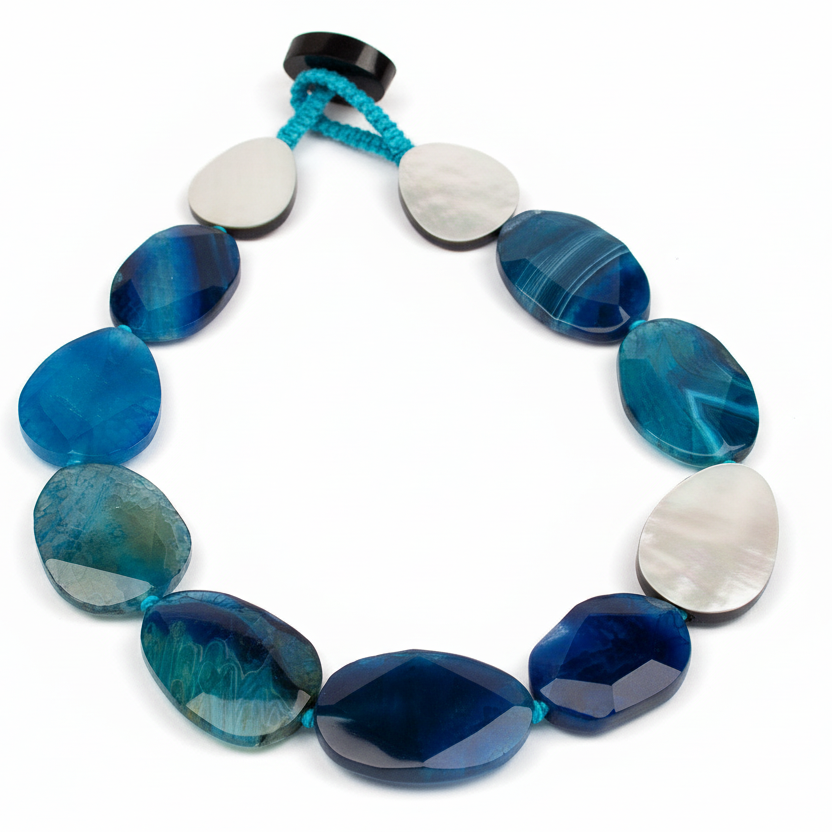 Designed to captivate, this blue agate statement necklace is a refined expression of color, light, and natural artistry. Faceted blue agate stones shimmer with depth and movement, reflecting subtle variations that feel both powerful and serene. Silver mother-of-pearl accents introduce a luminous contrast, adding softness and quiet sophistication to the bold composition.