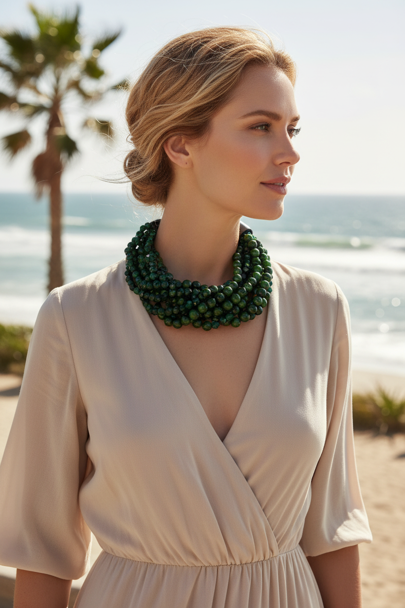 This emerald green tiger eye torsade statement necklace commands attention with its rich color, sculptural texture, and fluid movement. Luxuriously twisted into layered strands, the design features a striking interplay of faceted and smooth round tiger eye beads, creating depth, dimension, and a luminous, light-catching shimmer.
