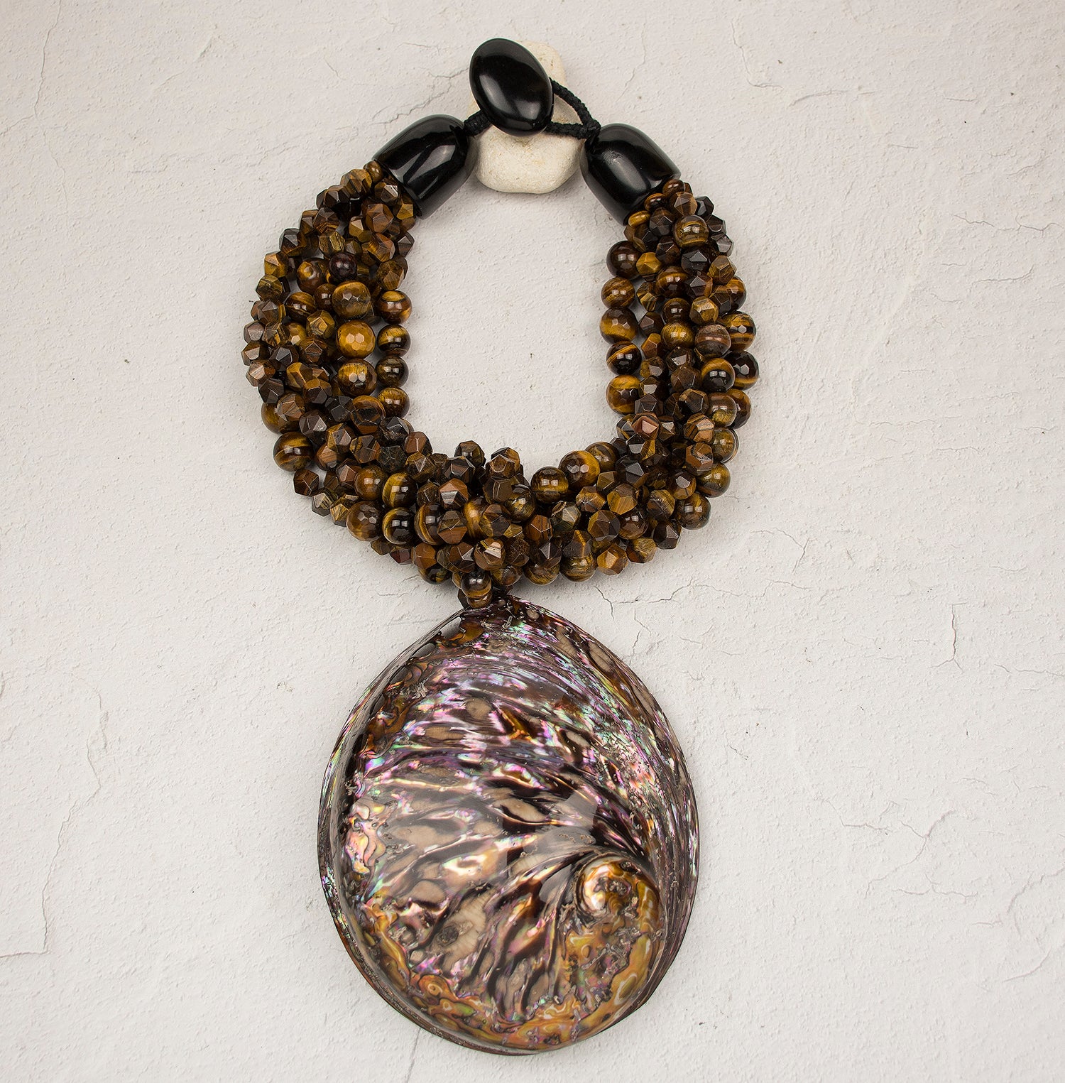 At the center, an oversized abalone shell pendant—approximately 5½" x 5"—commands attention with luminous bronze tones and iridescent flashes that shift beautifully with every movement. Each shell is naturally unique, making every necklace a one-of-a-kind statement.