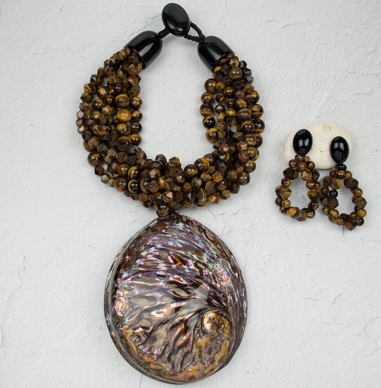 ARTISAN TIGER EYE & ABALONE STATEMENT NECKLACE.BROWN/BRONZE